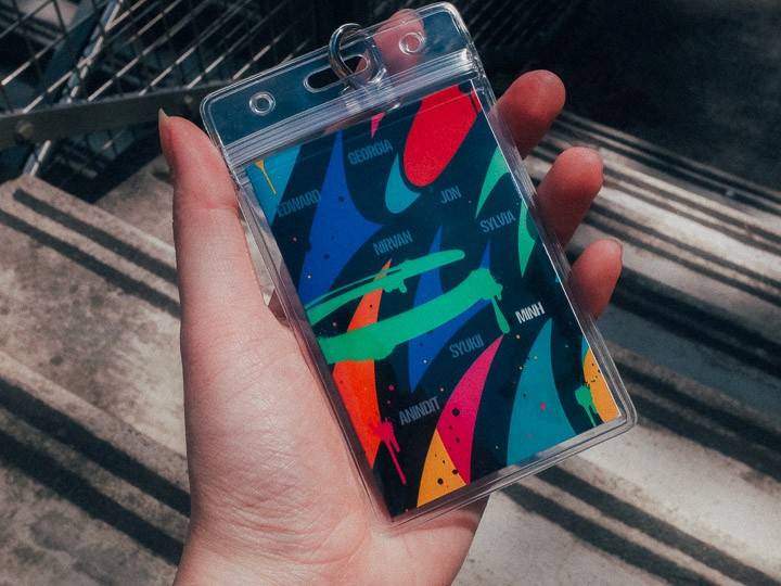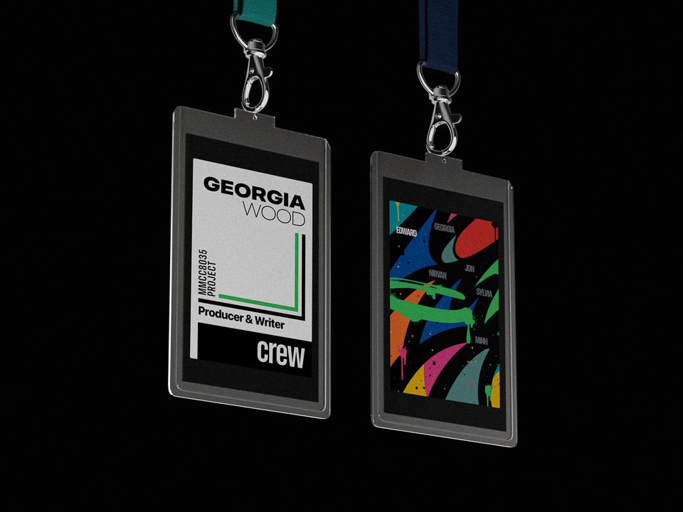 I also designed and printed a set of custom name badges for the crew, the look of which exhaustively aligns with my Swiss-brutalism obsession at the time. I thought it was a groovy way to relieve stress outside of production commitment. (Though I cut my palm with a really sharp knife while trimming the badges and lost an unreasonable amount of blood.)