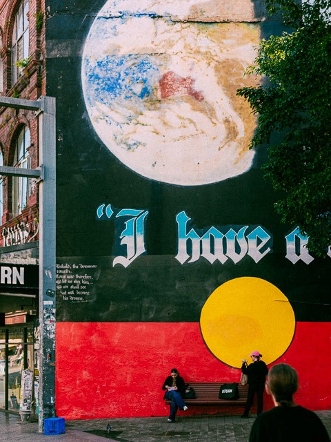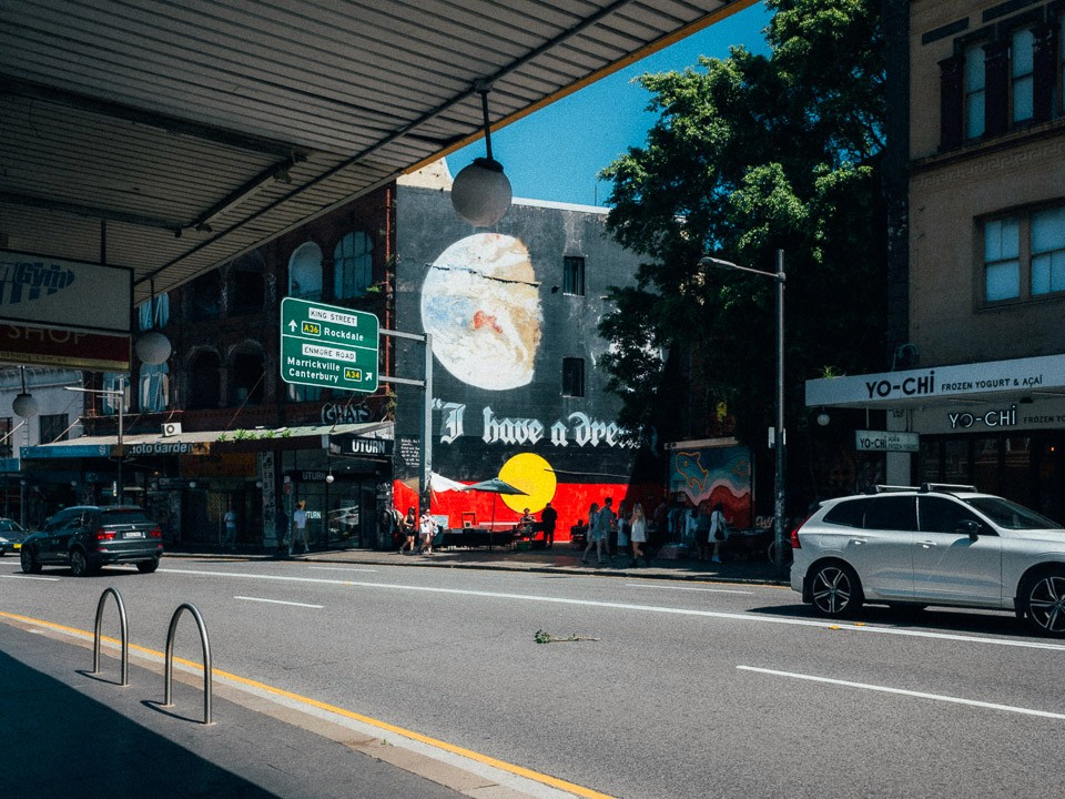 Our short documentary centres on two street artists who couldn't be any more different. Mistery, one of Sydney's foundational graffiti writers, contrasted with Oliver Wall, an emerging muralist with a formal fine arts background. In conversation with them, we painted a portrait of an overlooked subculture in constant negotiation with itself, over legality, authorship, meaning, and who gets to decide what belongs on a wall. Below: heritage-listed I Have a Dream mural, King St, Newtown.